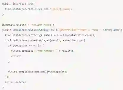 服务端接口返回值为 CompletableFuture,这样采用透明 RPC 调用时就可以实现异步化。
