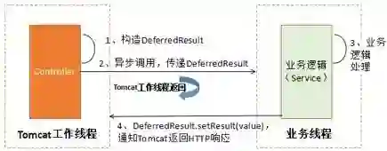 以 DeferredResult 为例,它的异步处理流程如下所示: