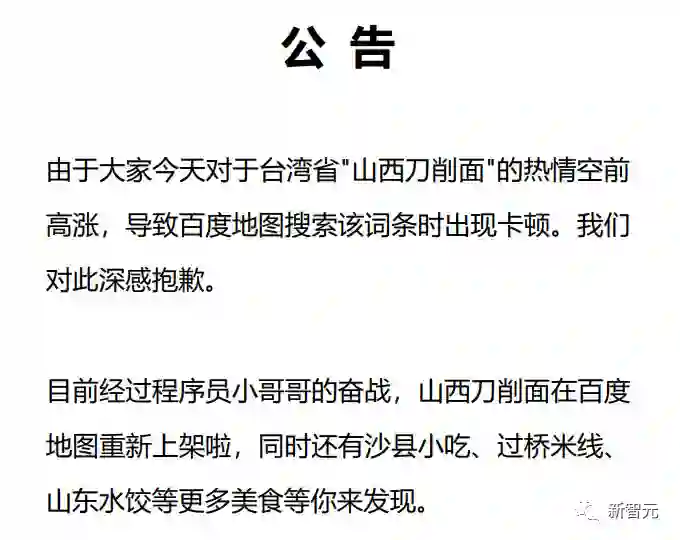【新智元导读】这几天,手机里的台湾省地图越来越清晰了。吃货们发现海峡对面的「山西刀削面」,激动得把百度地图都搞崩了!
