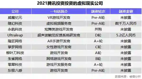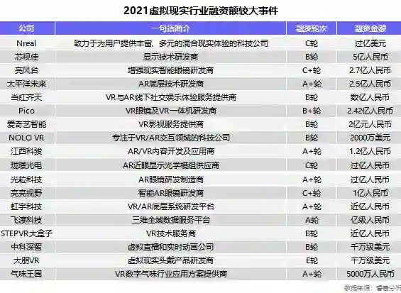 据睿兽分析显示,2021年全年VR/AR行业发生融资事件226起,融资金额约412.52亿元人民币。在近眼显示、交感知交互、内容制作等领域一批优质企业逐步成熟化,同时一批新生企业也崭露头角。