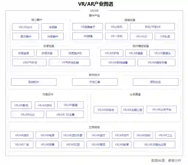 虚拟现实产业各环节日趋成熟,主要有硬件产品、软件技术、内容创作、分发渠道、应用领域。