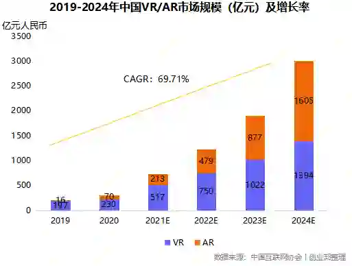 2020 年全球 VR/AR 市场规模约为900亿元人民币,同年中国VR/AR市场规模约为300亿元人民币,占当年全球市场的30%。伴随着5G技术的快速发展和元宇宙的爆发,中国虚拟现实市场规模将呈现高速增长,预计2020年-2024年中国虚拟现实产业复合增长率达到69.71%。