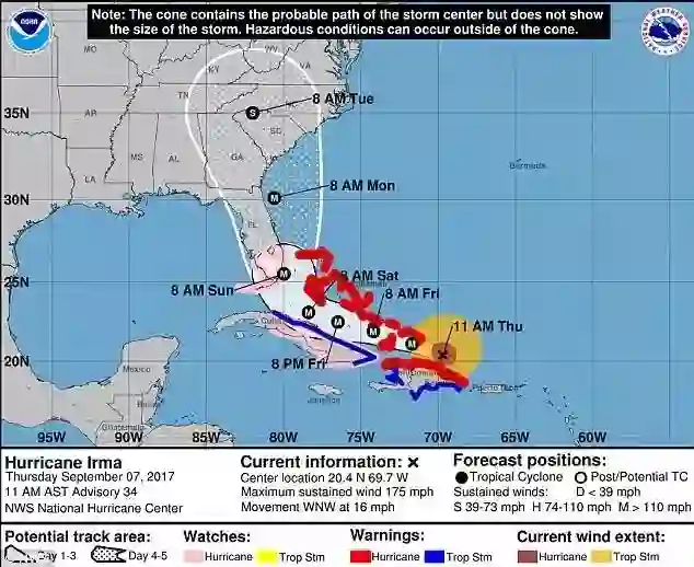 Irma的登录路线不偏不倚,以排山倒海之势,从海地到古巴,席卷了整个弗罗里达州后又北上深入大陆。飓风给弗罗里达州造成重创,至少42人因风暴而丧生,约650万的居民无法使用电力,弗罗里达州的部分地区现在还要面临洪水的威胁。飓风现已降级为热带风暴,并往亚特兰大州和亚拉巴马州移动。