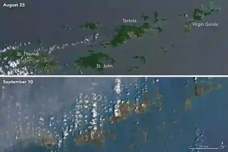 在8月25号飓风袭击前,这些海岛都还是绿色的,但在九月10号飓风袭击过后,从图上看,它们就变成棕色的了。这可能是因为飓风强大的威力已经将植物都连根拔起,只留下光秃秃的土地,也可能是因为植物的绿叶都被带着盐粒的海风打走了,只留下光秃秃的枝干。