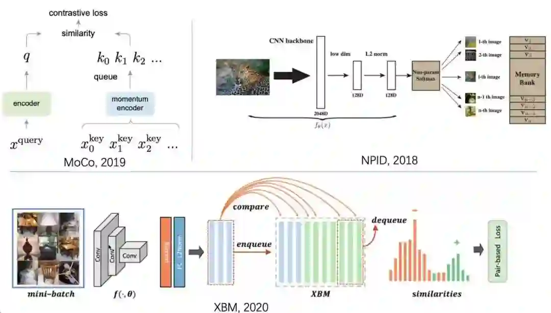 此外,我着重推荐一些我非常喜欢的一些memory bank相关的工作。memory bank的思想是通过一个特征队列来记忆过去大量的特征,并和当前特征组成海量的特征对来提升模型的表征能力。