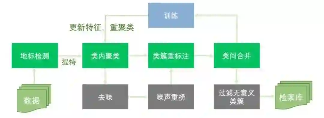 使用基于开源数据集训练的分类模型对地标图片进行提特后,我们对同一类目下的所有样本进行DBSCAN聚类,目的是用来去除同类目下的离群(噪声)样本,同时把同类目(A)下图片聚成多个类簇来重标注为多个子类(a1, a2,...),用于后续的模型训练。