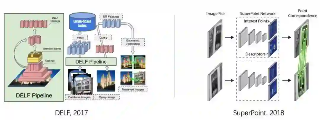 图3-3 Local feature 方法示意图,左:DELF,右:SuperPoint