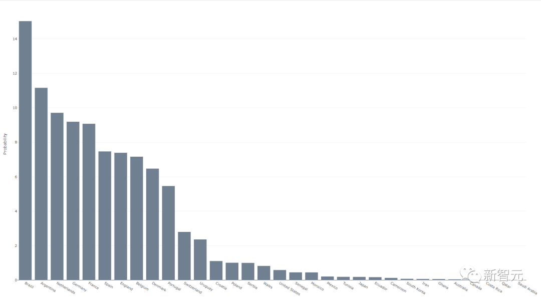 比利时和阿根廷分别是夺冠的第2和第3大热门,概率分别为18%和13.5%。