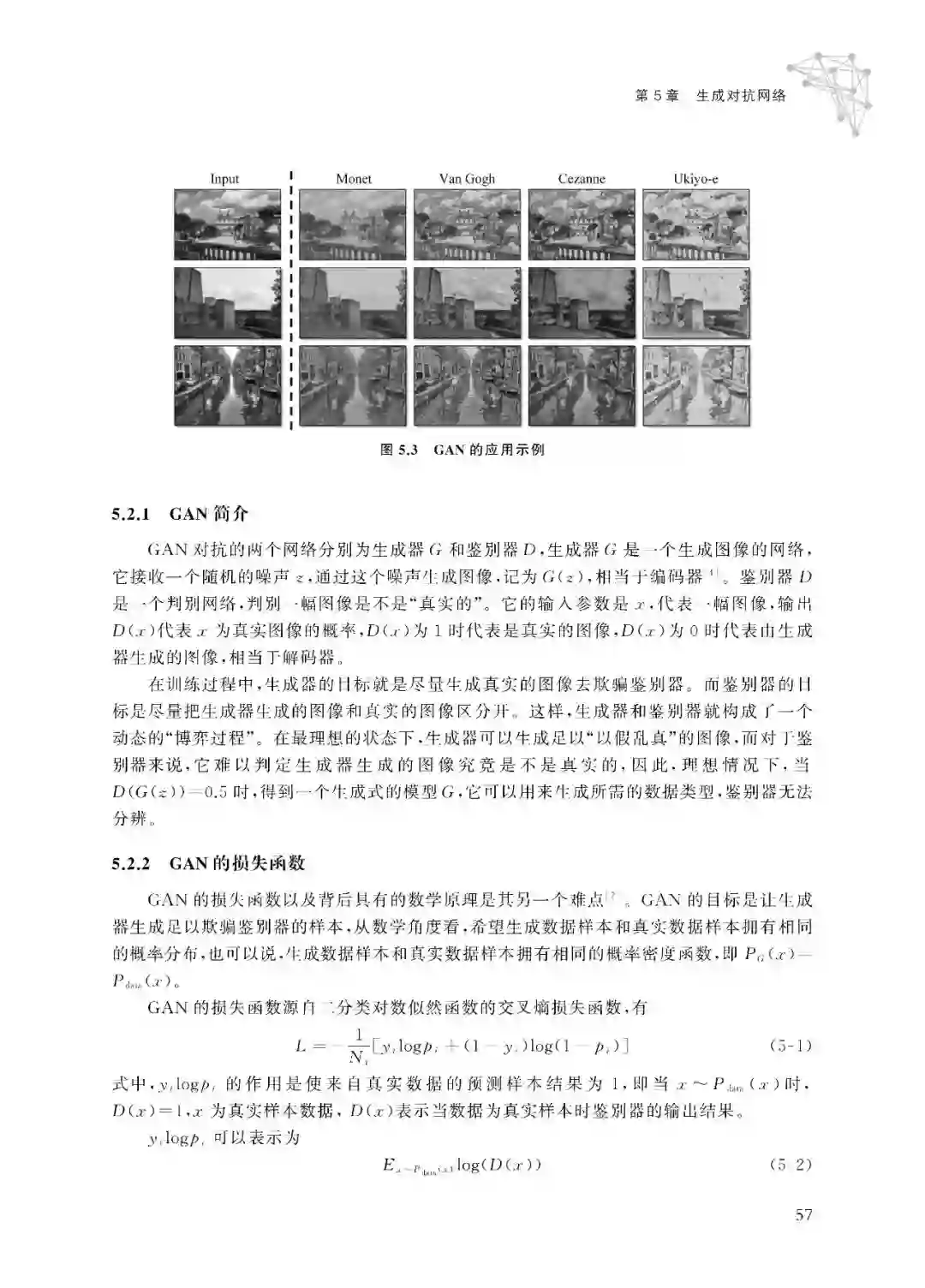 著名物理学家费曼说过一句话:“只要是我不能创造的,我就还没有理解。”生成模型恰 如其所描述的,其应用包括: (1)生成模型的训练和采样是对高维概率分布问题的表达和操作,高维概率分布问题 在数学和工程领域有很广泛的应用[3]。(2)生成模型可以以多种方式应用到强化学习中。基于时间序列的生成模型可用来对 未来可能的行为进行模拟;基于假设环境的生成模型可用于指导探索者或实验者,即使发生 错误行为,也不会造成实际损失[4]。(3)生成模型可以使用有缺失的数据进行训练,并且可以对缺失的数据进行预测。(4)生成模型可以应用于多模态的输出问题,一个输入可能对应多个正确的输出,每一 个输出都是可接受的[5]。图5.2是预测视频的下一帧图像的多模态数据建模示例。神经网络的发展大致可以分为神经网络的兴起、神经网络的萧条与反思、神经网络的复 兴与再发展、神经网络的流行度降低和深度学习的崛起共5个阶段。