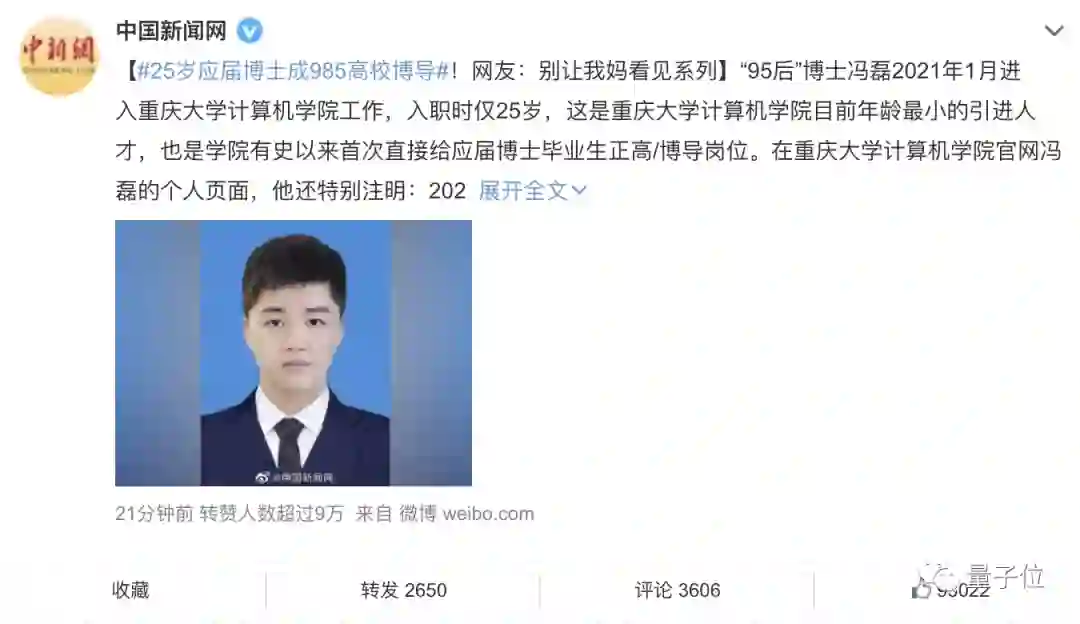 他叫冯磊,1995年4月出生,之所以25就能博士毕业,那是因为他直博,并只花了三年半的时间就提前毕业了。