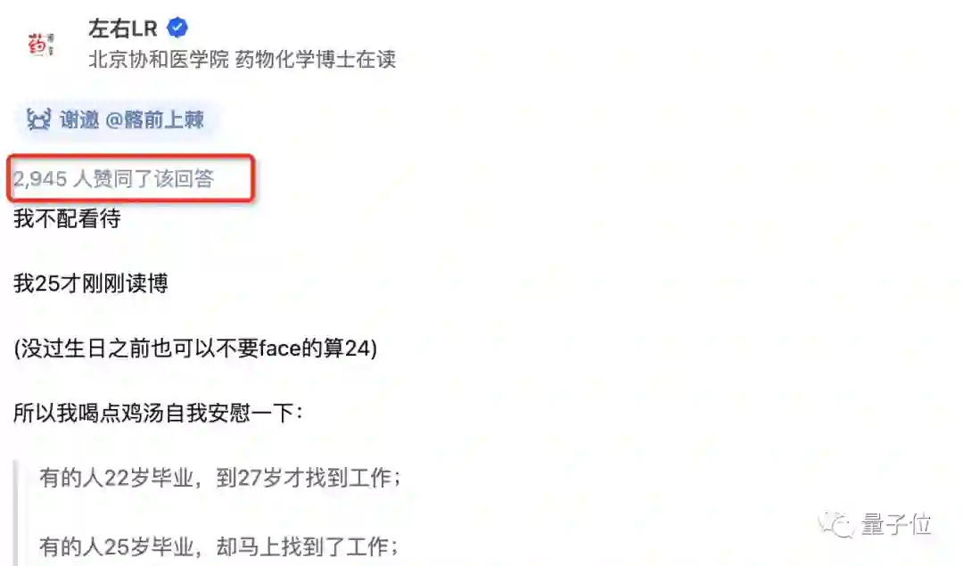 最后,在知乎“如何看待重庆大学引进25岁博导冯磊……?”话题下,得赞最高的是一个“喂自己鸡汤”的回答: