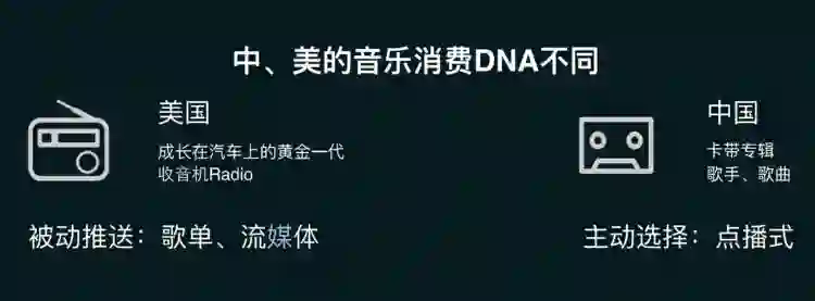 美国的音乐消费者是成长于汽车上的黄金一代,汽车上都配备收音机,所以他们的音乐消费是从听收音机开始的。大家习惯了这种背景式的、实时存在式的播放,在任何一个生活场景里面都会有音乐存在,这种情况下,他们更倾向于流媒体音乐形式。