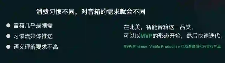 当我们再看 Amazon Echo 在北美刚开始的成功,其实就在于 Amazon Echo 首先解决了家庭环境听音乐的痛点,可以让音乐一天不停地播放,使得 Amazon 可以以 MVP(minimum viable product,最小化可实现原型)的形式,拿出一款产品来迅速交付消费者并进行迭代。