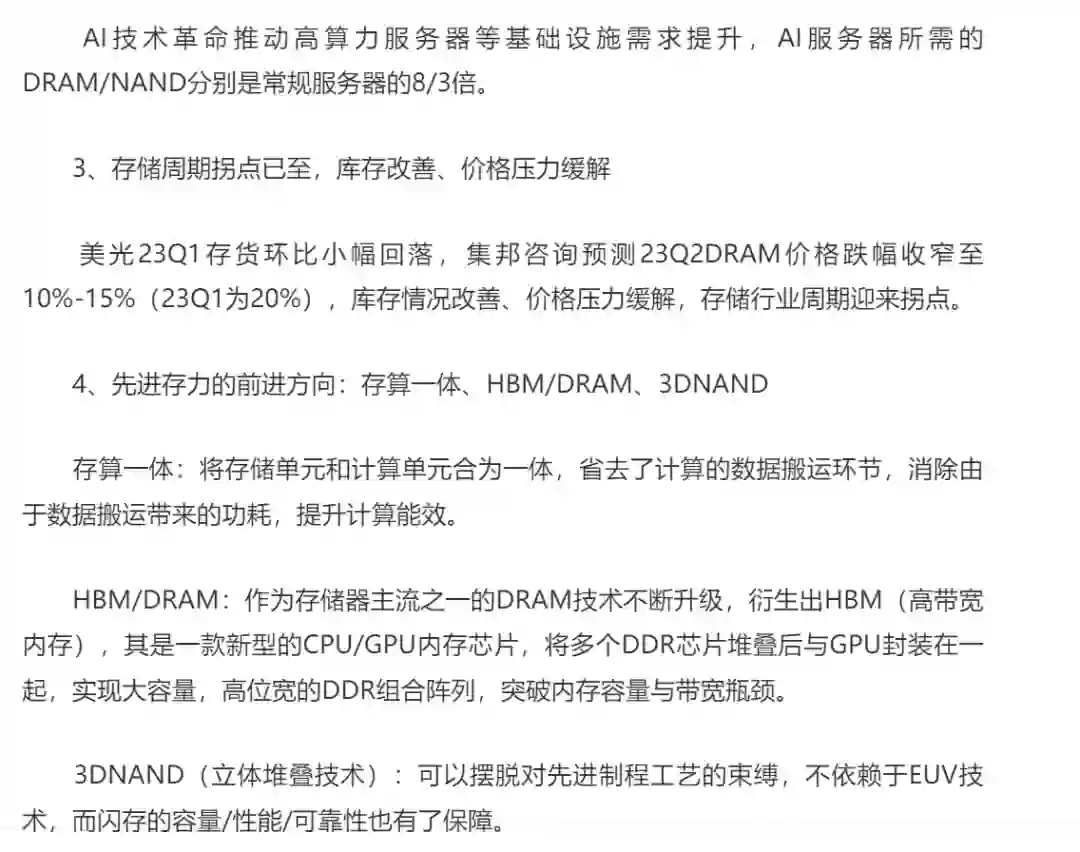 2023年3月31日,我国发起对美光在华销售产品的网络安全审查,体现出存储产业安全的重要性。此外,AI算力需求拉动高算力服务器出货,而AI服务器的存力需求更强,AI将驱动“从算力到存力”的中长期需求: