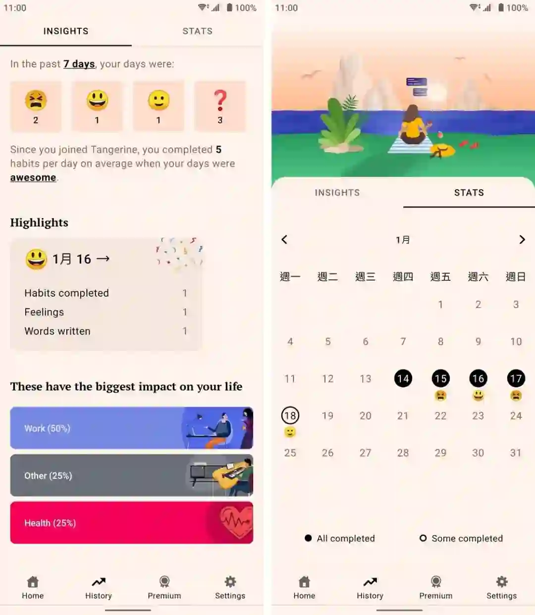 Tangerine 的习惯追踪和情绪记录均为免费功能,同时 Tangerin 也提供了订阅服务,订阅可以解锁历史回顾和数据分析功能。