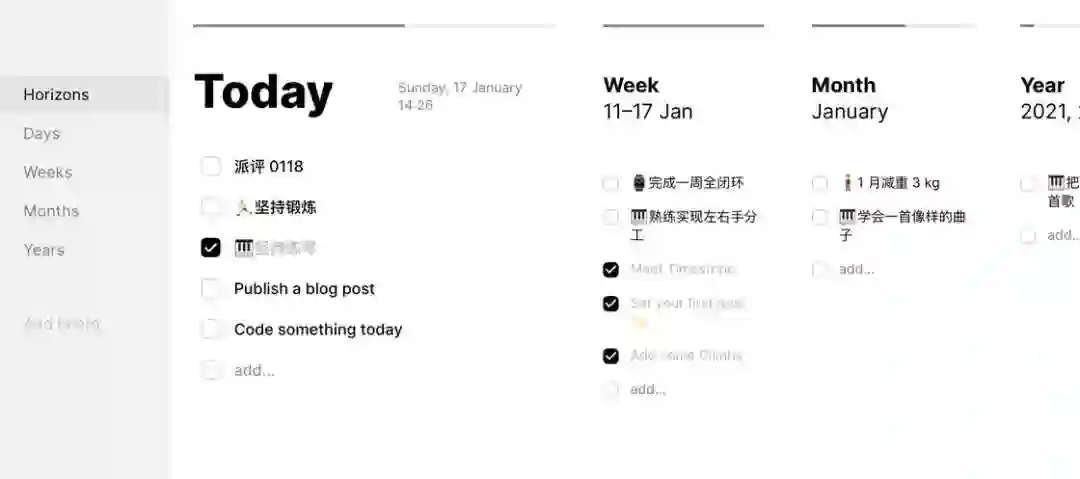 即使抛开「完成目标」这一特点,Timestipe 也是一款不错的全平台任务管理工具。它的 Horizon 视图能够帮你更加清晰地了解当日、本周的任务,让你在完成任务时拥有更加清晰的条理。