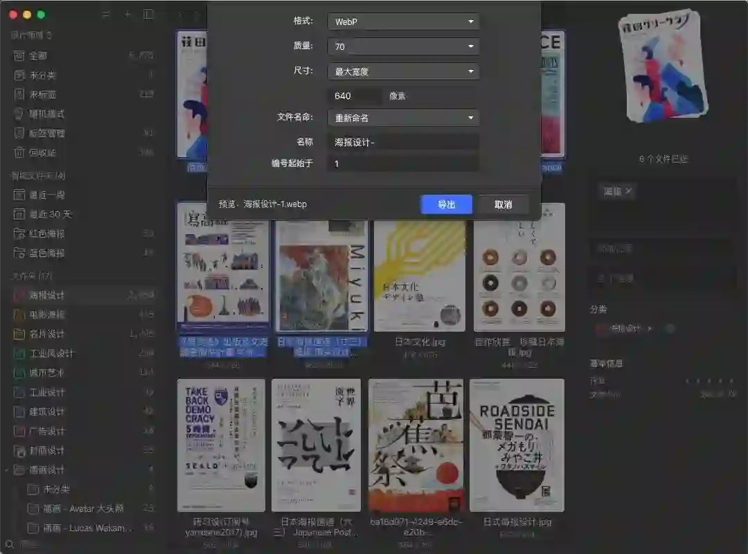 此外,Eagle 2.0 还加入了对更多图像格式和字体的支持,例如 Adobe InDesign、CLIP STUDIO PAINT 和 Edraw 的文件格式,以及 TTC 和 WOFF 字型格式,都可以统统塞到 Eagle 中了。而对于图像导出,Eagle 2.0 支持对其导出尺寸和格式更多自定义设置,非常方便。