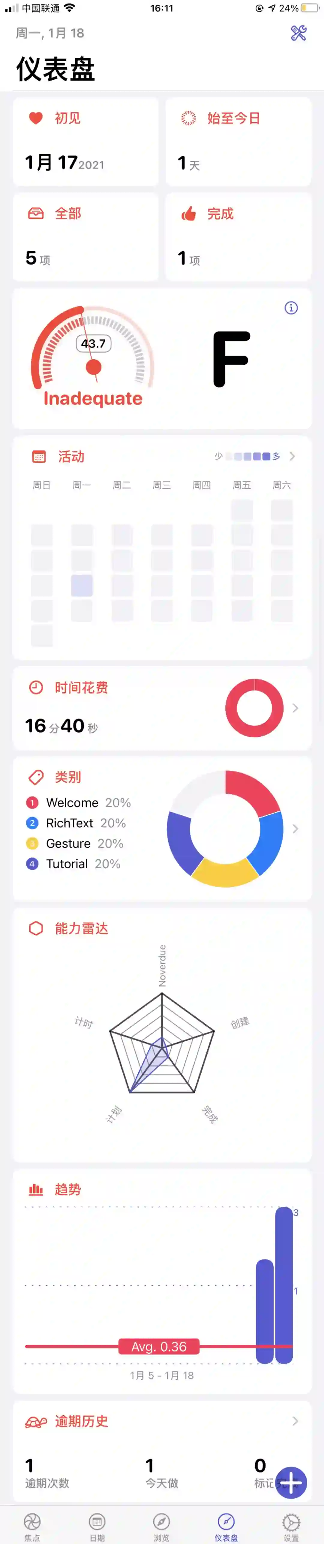 仪表盘界面将中心放在了整理复盘任务系统上,列举了多个可供观察的维度,比如任务分就根据逾期任务的时间和个数,以及创建、计划和完成任务的数量对个人执行力进行评估。余下的诸如标签饼图、能力分布图和任务数量趋势都从不同角度帮助用户更清晰地认识自己的任务系统以及完成力与系统的匹配程度。