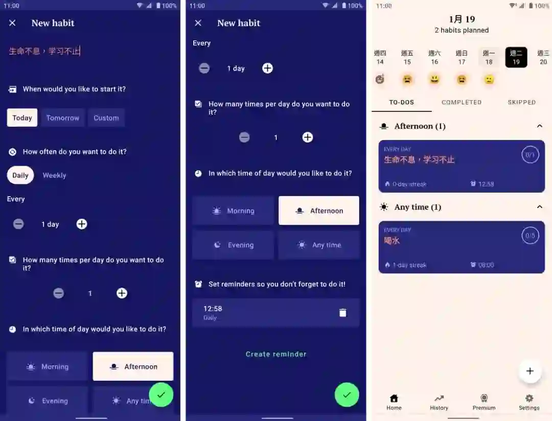 针对用户想要养成的具体习惯,Tangerine 的设置基本覆盖了所有细节,无论是习惯完成的频率还是习惯完成后的打卡提醒,Tangerine 均有提供。举例来说,针对喝水这一高频习惯,用户可以设置每天多次提醒,而对于一些间隔时间段所需完成的习惯,如打扫卫生等,Tangerine 也允许用户进行设置。