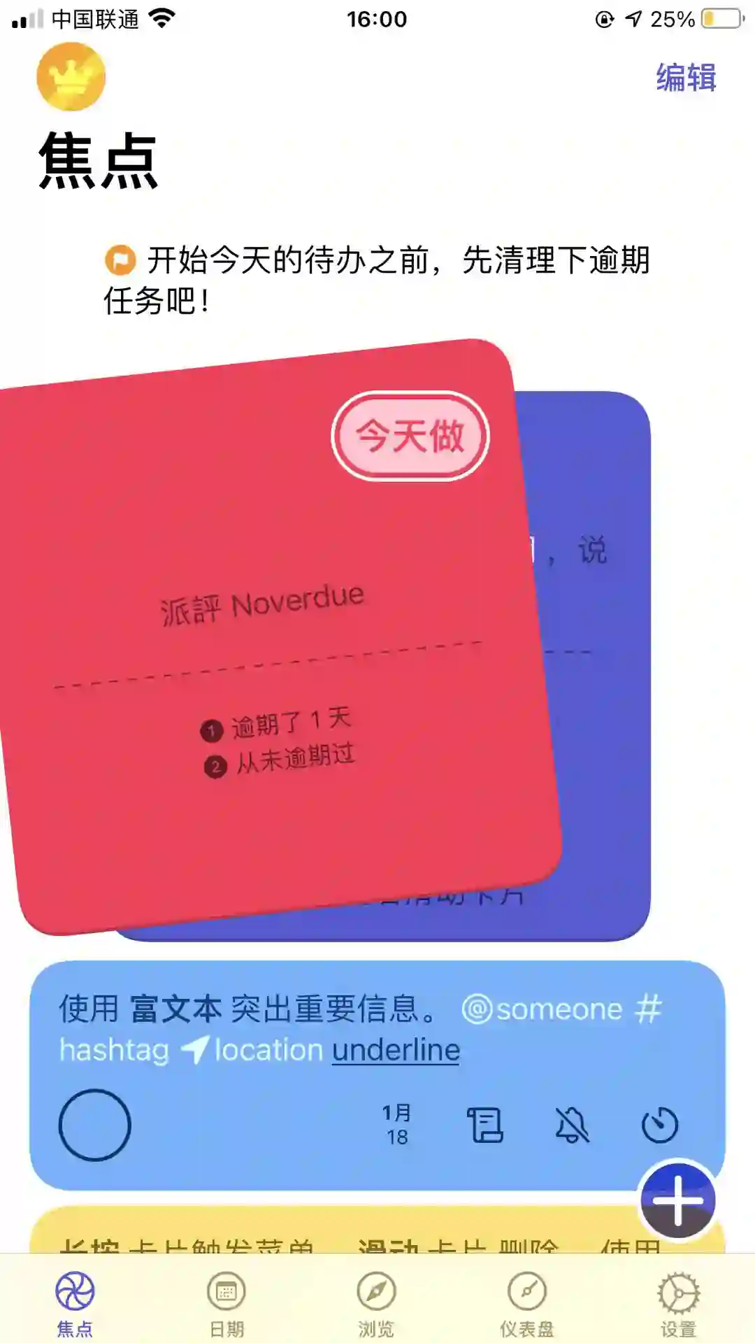焦点界面以已逾期的卡片为主导,将滑动和长按作为菜单和快捷动作的唤醒手势,覆盖了「标记完成」「标记死线」和「丢弃」等常用动作,界面下部则是以滑动列表的形式按时序展示各任务。每一卡片都使用富文本为载体,方便在 iPad 和 iPhone 直接切换编辑。应用支持使用粗体和删除标明任务的关键部分和次要信息,使用 @ 表示联络人,使用 # 表示标签以将任务分类整理,还可以记录地点触发提醒。