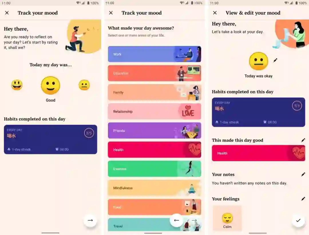 如此设计,初一上手可能会使用户感到过程繁琐,但是结合日常生活的经验来,即使有时候某一天非常糟糕,但我们还是可能因为某一件小事而感受到正向情绪。