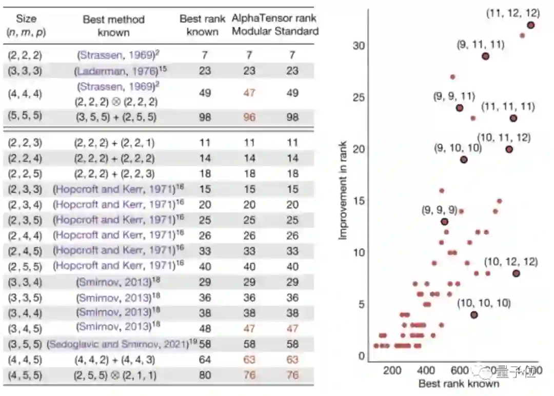 具体而言,AlphaTensor一共改进了70多种不同大小矩阵的计算方法。