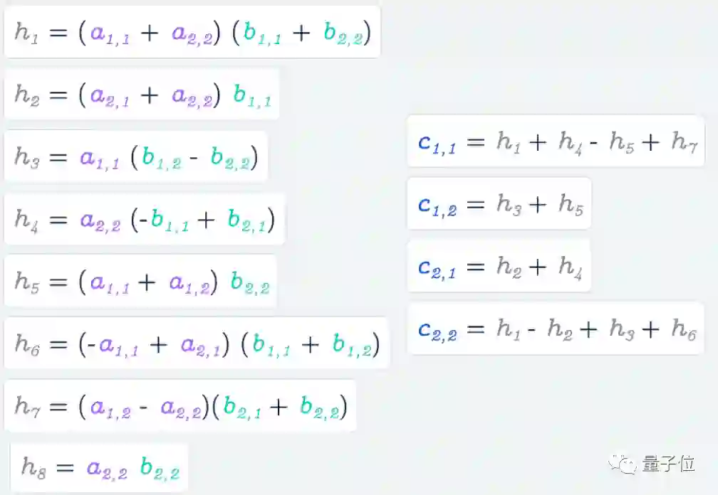 他巧妙的通过构造7个中间变量,用增加14次加法为代价省去了一次乘法,这种方法被称为“施特拉森算法”(Strassen算法)。