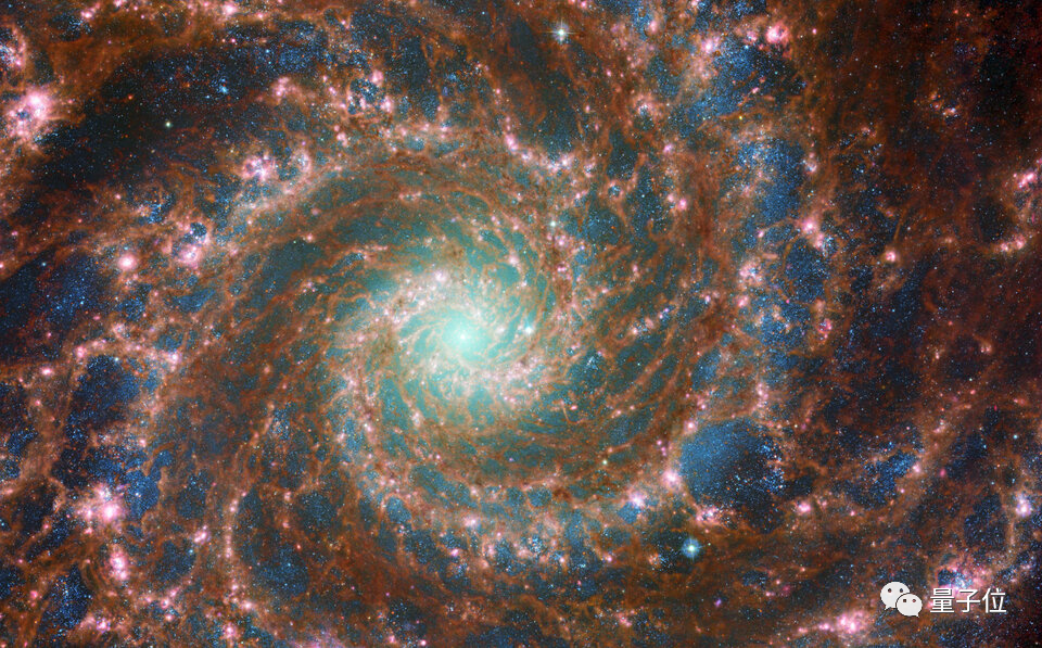韦伯望远镜捕捉到了M74旋臂中细微的气体和尘埃丝,它们从图像的中心向外旋转。即使在缺乏气体的核区域,也提供了星系中心核星团的清晰图像。