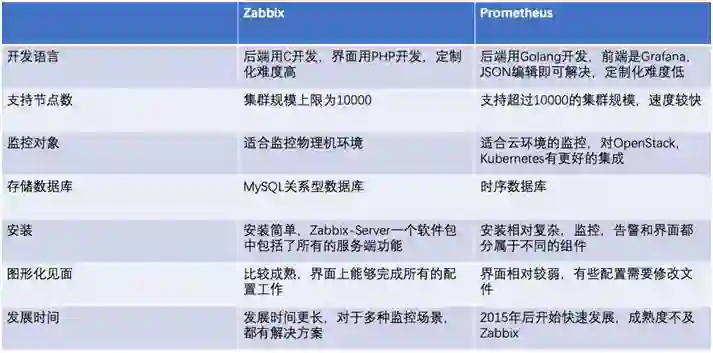 Zabbix 的成熟度更高,上手更快。高集成度导致灵活性较差,在监控复杂度增加后,定制难度会升高。而且使用的关系型数据库,对于大规模的监控数据插入和查询是个问题。