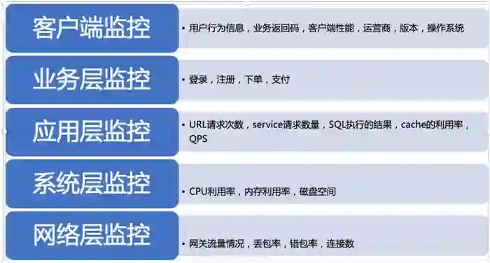 业务层监控,核心业务的监控,例如:登录,注册,下单,支付等等。