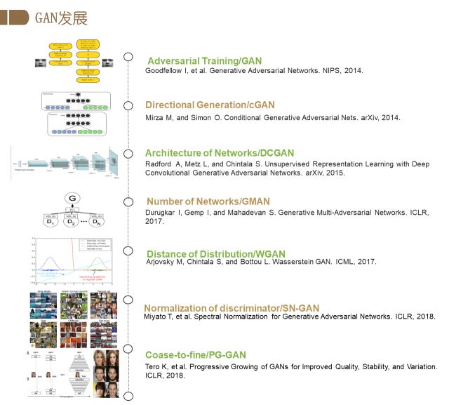 从2014年GAN的提出,实现了从噪声生成图片功能后,生成对抗网络的研究方向越来越多。原始的GAN只是从随机噪声生成图像,缺少对生成图片的控制,所以紧随其后就有研究者提出了Conditional Generative Adversarial Nets。其通过改变输入条件,可以控制图片的生成结果。同时,以DCGAN为代表的一系列工作探索了适用于GAN的网络结构。也有研究者为了解决模式坍塌等问题,提出了更多的网络形式进行对抗学习的研究,如GMAN。 修正GAN的对抗损失函数的工作也在一直进行中,WGAN是其中非常引人瞩目的工作。此外,要拟合真实数据背后的分布度量,常常需要对D网络进行正则化, SN-GAN提出的谱归一化是其中的代表性工作,其可在IMAGENET数据库上训练成功,生成1000类的图像。最后,提高大图像的生成质量也是GAN的一个重点的研究方向。英伟达提出的PG-GAN即是这样的工作,可以生成1024x1024的高清真实图像。