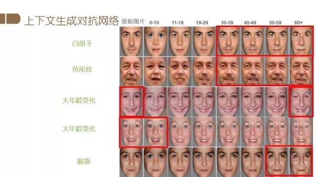 针对人脸编辑的另一个应用是人脸老化。下图中间是当前给定图片,通过人脸老化算法可以生成7个不同年龄段的人脸图像,即可以变年轻如10岁以下,也可以变老如一直到60岁以上。它的应用很广泛,比如可以辅助跨年龄段的人脸识别。身份证照片常常是很多年前拍摄的,长时间没有更新导致人证对比存在一定的难度,那么此时人脸老化的就可以辅助身份证的人证识别。另外比较有用的应用是寻找丢失的儿童,比如小孩走丢了,只有他很小的照片,人脸老化可以辅助生成长大后的样子,我们希望可以通过这样的算法,能够实现跨年龄的身份识别。此外人脸老化编辑还可以应用到互动娱乐应用中。