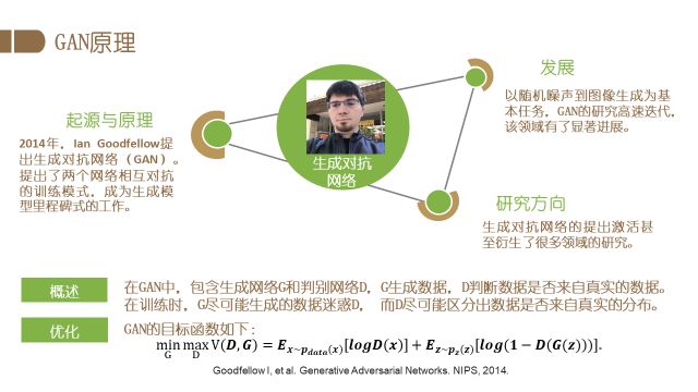 本文将主要介绍以人为主体目标的图像理解与编辑任务。首先介绍人脸编辑。在图像编辑方面,生成对抗网络(GAN)发挥着重要的作用,所以这里首先介绍一下GAN的基本原理以及当前的主要发展方向。GAN由Ian Goodfellow在2014年提出,采用了两个网络相互对抗的训练模式,已成为生成模型中里程碑式的工作。GAN包含生成网络G和判别网络D,G生成数据,D判断数据是否来自真实的数据。在训练时,G尽可能生成的数据迷惑D,而D尽可能区分出数据是否来自真实的分布,通过这种对抗式学习,模型最终能够生成非常真实的图片。这一工作也得到了Yann Lecun的高度评价,被其称为近十年来机器学习领域中最有趣的想法之一。