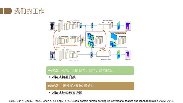 我们在人体解析方面的最新研究是有关跨域人体解析。因为比如想在多个城市建立图像分析系统,不可能在每个场景都标注很多数据,但是不同应用场景很多条件确实不一样。所以我们希望一旦建立了较好的模型,通过跨域的方法,该模型放在其他的特定场景中也可以使用。比如数据库标了很细致像素级的分类,这些库姿态多变,光照很多,数据量大。我们在实际应用的时候,比如想应用在室内餐厅,或者室外街道,这种情况下重新标注数据的代价是非常大的,而直接使用预先训好的模型效果又不是特别好。我们想研究的就是已经训练好的模型怎么使用。