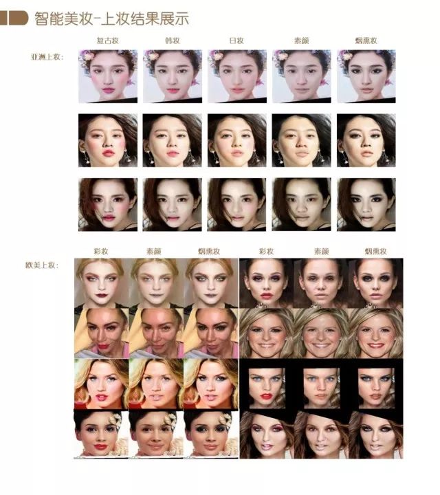基于GAN,在人脸图像编辑方面,我们课题组主要进行了智能美妆方面的研究,属于图像到图像的生成领域的探索。首先我们构建了一个较大的美妆数据库,包括东方风格和西方风格的子数据库。东方风格包括复古妆、韩妆、日妆、素颜和烟熏妆,西方风格包括彩妆、素颜和烟熏妆。如图所示,每种妆容都有明确的定义。