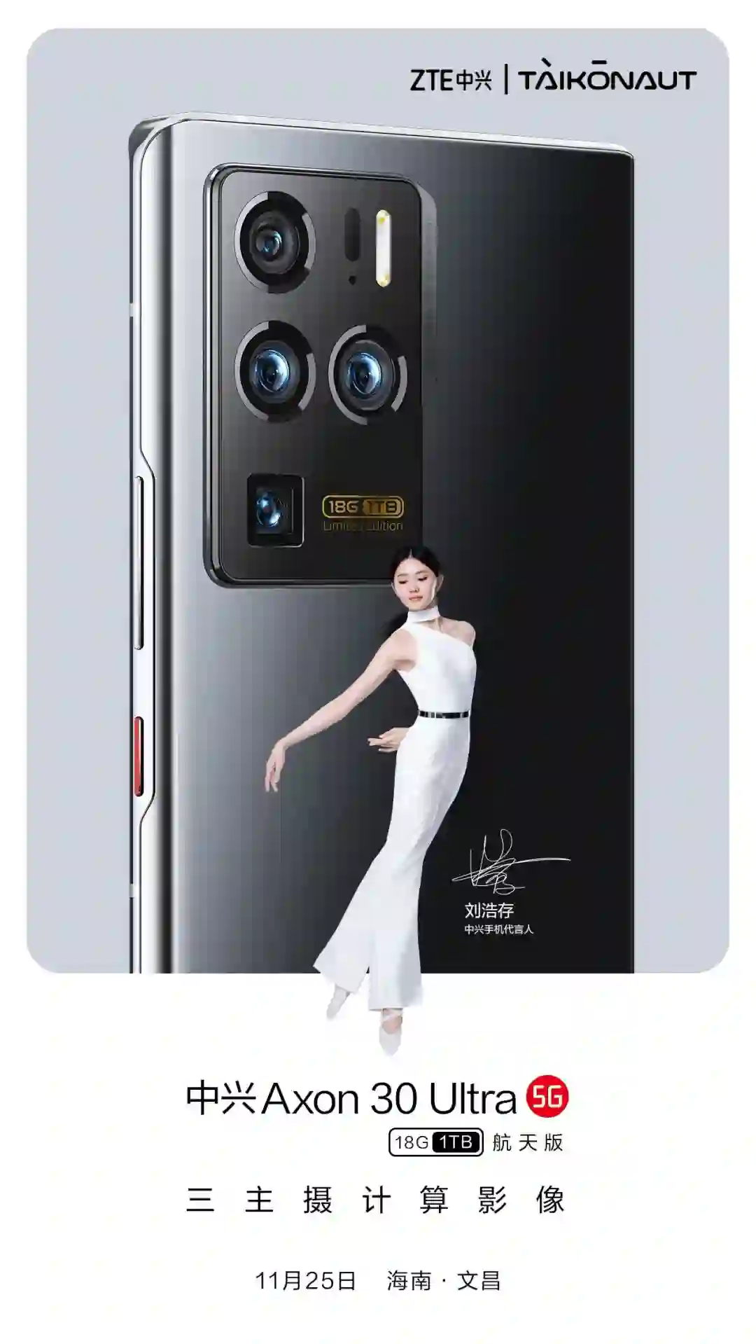 中兴手机今日微博官宣新品中兴 Axon 30 Ultra 5G 航天版,这款新品就是前几日终端事业部总裁倪飞透露的为位中国航天员送上祝福的航天版新品。这款航天版新机将全球首发 18GB+1TB 版本,将是目前行业内内存和存储容量最大的旗舰手机。配置方面,中兴 Axon 30 Ultra 5G 航天版搭载多主摄阵列融合影像,配备内存融合技术 Pro,配备 6400 万像素主摄+6400 万像素超广角+6400 万像素人文镜头,预计会限量提供。官方表示将于 11 月 25 日在海南文昌发布,价可能会突破 7000 甚至 8000 元。