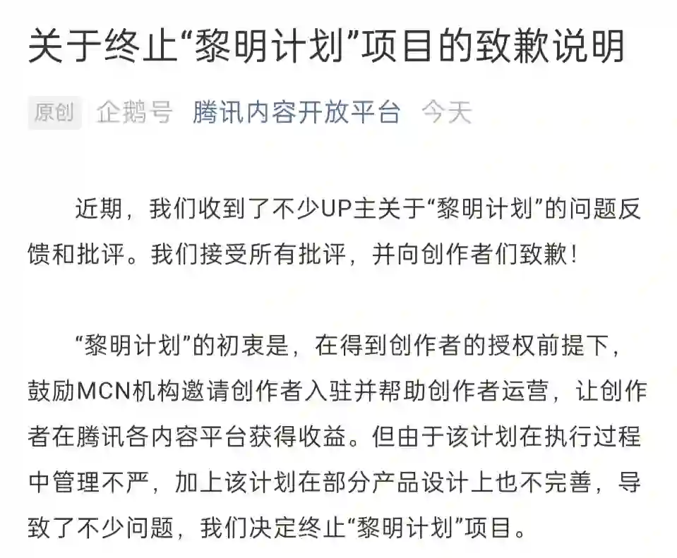 今日,腾讯内容开放平台公众号发文宣布终止“黎明计划”。腾讯推出的“黎明计划”是初衷是为了吸引更多的创作者入驻腾讯旗下的各个平台分享创作,据悉成功加入该计划的创作者可以获得对应的奖金奖励,可是鉴于腾讯自述的“管理不严,产品设计不完善”原因,因此腾讯终止黎明计划并向 UP 主道歉。