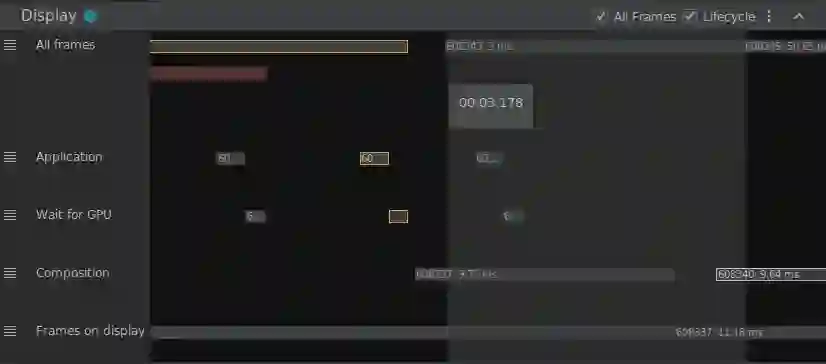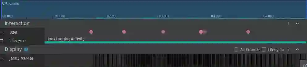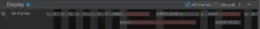 6. 与应用互动以收集数据,然后点击 Stop 按钮。Android Studio 将显示 Display 窗格,其中可见卡顿帧,也可以选中 All Frames 复选框,让轨迹记录也显示非卡顿帧。