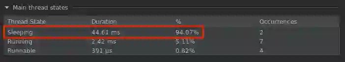 此外,如详细分析窗格中的主线程状态所示,大量线程所处的状态是正在休眠。