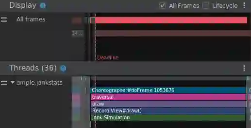 1. 在 Janky frames 轨迹中选择一个卡顿帧,Display 窗格将突出显示相应的生命周期数据,Threads 窗格将突出显示相应的线程数据。