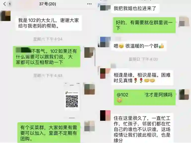 我们这栋楼有两家老人的子女被封在了自己的小区,没法照顾到他们。老人也不会用手机,他们就加到了我们这个群里,这样他们也可以第一时间知道我们小区的情况,如果有需要也可以联系到我们。