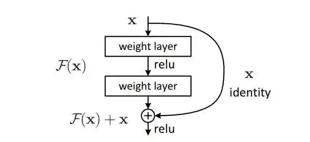 首先是 ResNet,深度残差网络,2015年ImageNet挑战赛冠军。通过如下图所示的残差块实现网络层上的跳跃,从而将模型的优化目标从寻找函数的等价映射改为了逼近零,弱化了网络变深对模型性能的负面影响。目前为止,基于ImageNet数据集训练的ResNet50仍然是图像处理任务中使用频率最高的预训练模型之一。