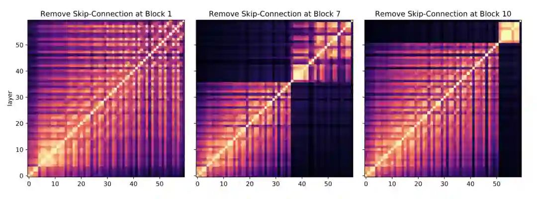 另一方面,这种差异的原因还可能来自ViT从底层到高层的相似度比ResNet高的这一现象。研究者认为,是ViT中的跳跃连接结构 (skip connection)保护了底层到高层的表征传递,如下图所示,如果撤掉特定块区上的这种连接结构,对应的表征信息就会立刻“失传”。
