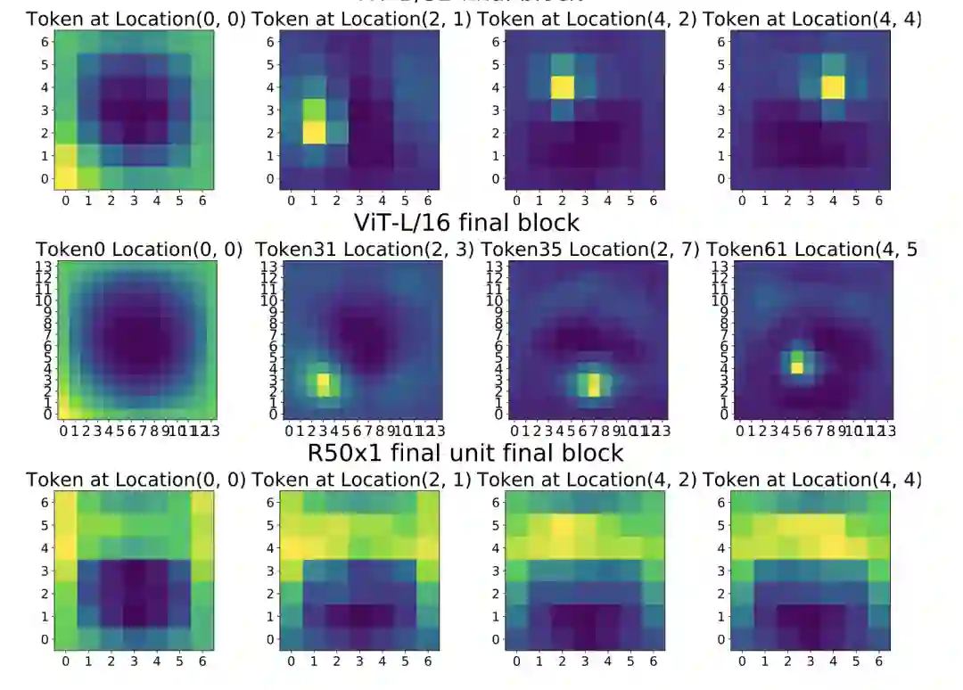 两个在底层表征上有相似之处的网络,居然长着长着发展到了两个方向。因为ResNet在处理输入时,需要经过更多层才能获得类似于ViT底层的表征,由此引发了一个合理的猜想:两个网络在整合全局信息的能力上存在差异。