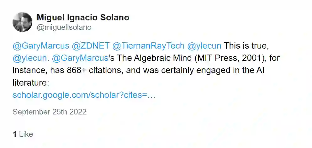 「Gary Marcus不是一个搞AI的,他是一个心理学家。他从未对人工智能做出任何贡献。他在实验心理学方面有不错的成果,但他从来没有写过一篇关于人工智能的同行评审论文。没错,有些人就是这样。」