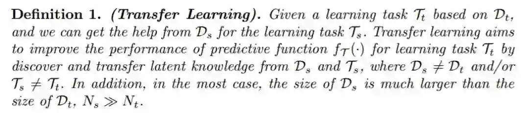 定义 1:(迁移学习)。给定一个基于数据 Dt 的学习任务 Tt,我们可以从 Ds 中获取对任务 Ts 有用的知识。迁移学习旨在通过发现并转换 Ds 和 Ts 中的隐知识来提高任务 Tt 的预测函数 fT(.) 的表现,其中 Ds ≠ Dt 且/或 Ts ≠ Tt。此外,大多数情况下,Ds 的规模远大于 Dt 的规模。