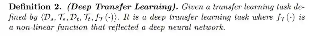 定义 2:(深度迁移学习)。给定一个由 <Ds, Ts, Dt, Tt, fT(.)>定义的迁移学习任务。这就是一个深度迁移学习任务,其中 fT(.) 是一个表示深度神经网络的非线性函数。