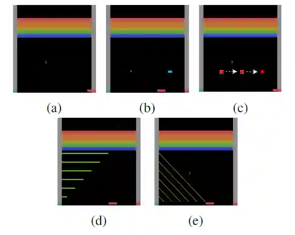 图 2 :(a) 为原始版本的打砖块游戏,其余为在背景上添加了一些小的视觉变化。(b) 添加固定蓝色矩形干扰,(c) 红色矩形在三个固定位置闪现 (d) 绿色线条干扰 (e) 对角线干扰。
