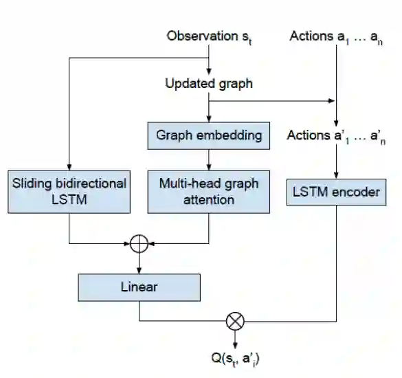 知识图是一个有向图,由一组语义三元组(主体,关系,对象)构成。在本文中,作者探索使用知识图和相关的神经嵌入作为域知识迁移的表示形式,以训练文字类冒险游戏的强化学习 agent,从而减少训练时间并提高所学习控制策略的质量。作者在 KG-DQN 的基础上展开他们的工作,探索知识图和网络参数的迁移。从静态文本资源中提取出 graph,并使用它向 agent 提供特定领域的词汇,对象能力等知识。agent 也能访问游戏解析器接收到的所有 action,通过提取解析器接收到的一系列模板(用 OBJ 标记替代 action 中的 object 或者名词短语),将 OBJ 标记更换为游戏给定词汇中可能的 object 即可。DQN 网络由两个独立的神经网络构成,分别编码 state 和 action,由最终的 state-action 对的 Q 值作为两个网络之间交互的结果,使用贝尔曼方程更新。