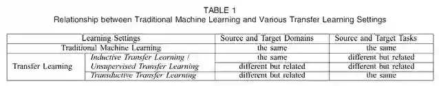 根据迁移学习的定义,表 1 中总结了传统机器学习与各种迁移学习设置之间的关系,其中根据源域和目标域与任务之间的不同情况,将迁移学习分为三个类别:
